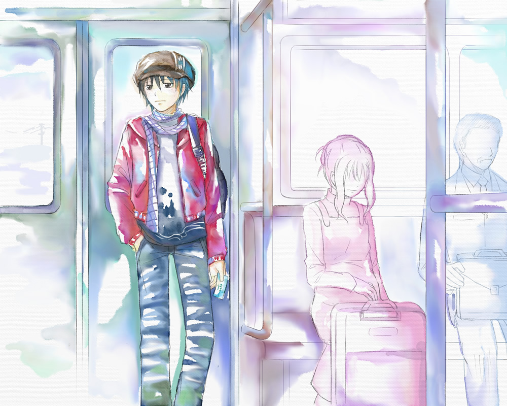 踩着列车出发的铃声冲进车厢,他喘着气站在门边,看着车门关上,然后列车开始启动加速。直到窗外景物开始飞速消失时,他才突然有了出行的实感。